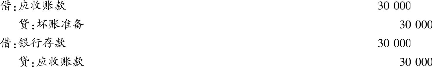 【例3-15】 6月25日,甲企业收回已作坏账转销的应收账款30000元,存入银行。甲企业的账务处理如下: