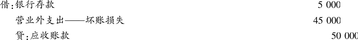 【例3-12】 某企业的一笔50000元应收账款,因债务人财务状况原因长期未能收回,年末经催收收回5000元,其余款项确实无法收回,确认为坏账。该企业在年末的账务处理如下: