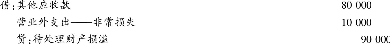 【例4-21】 甲企业为增值税一般纳税人,因台风造成一批库存材料毁损,实际成本为90000元,相关增值税专用发票上注明的增值税税额为11700元。根据保险合同约定,应由保险公司赔偿80000元。甲企业的账务处理如下: