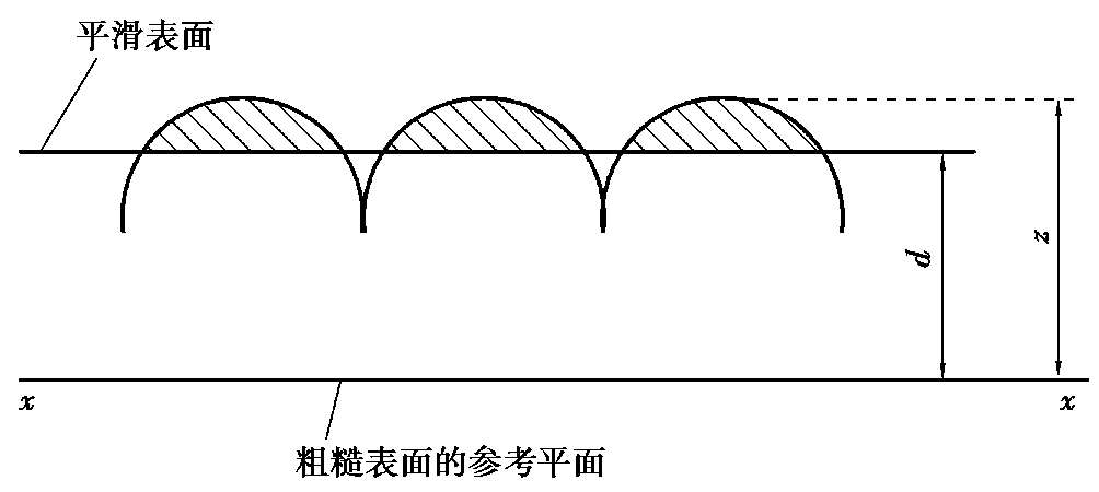 如图 1.13 所示,着重考虑忽略微凸体的存在,设用完全平滑的表面压入这些微凸体,法向变形量 δ 等于( z - d ),微凸体间没有互相作用,因此一个微凸体发生变形时不会影响另一个微凸体的高度。假设所有微凸体的变形都相同,即它们在垂直载荷 W 的作用下同时下移一距离( z - d )。