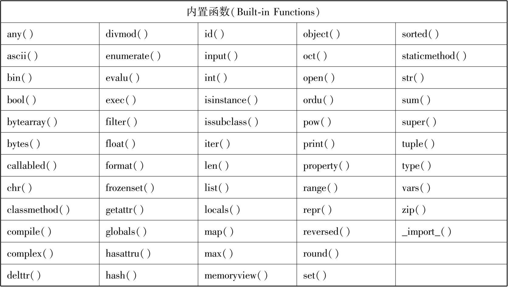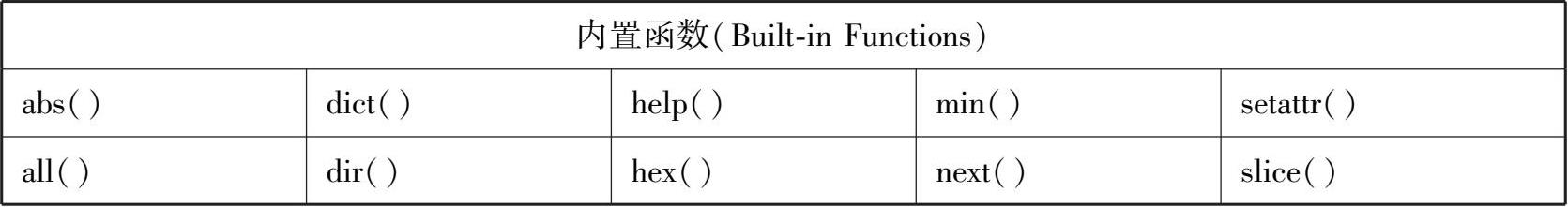 通过观察不难发现,Python中有些函数无须定义,使用时直接将要处理的对象放入函数名后面的括号中,即可得到处理结果。以 3.50 版本为例,一共存在 68 个这样的函数,它们被统称为内置函数(Built-in Functions),见表 5-1。内置函数即这些函数是Python“自带”的,在3.50 版本安装完成后就可以直接使用。之前的实例中已经用到了许多内置函数,例如len( )和range()函数。