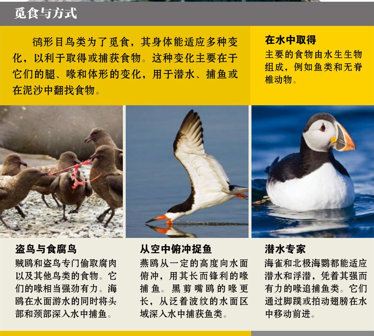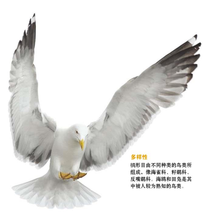 鸻形目是一个由众多鸟类所组成的目,包含多种类型的鸟类群体,像海鸟、滨鸟和涉禽。它们遍布世界各地,某些被人较为熟知,如海鸥、鸻鸟、丘鹬、贼鸥、海雀、北极海鹦等。它们的体形大小不一,从小体形至大体形皆有。它们与其他鸟类的主要不同之处体现在它们的脚和喙上,喙通常细且长,但某些物种的喙较短且粗。这些鸟类在海岸和海滩的湿泥地觅食,它们的腿细且长,有三只脚趾,脚趾之间至少有半趾通过蹼相连在一起,后脚趾通常都会退化或完全消失。它们大多数都擅于飞行,也能迅速地在沙滩或在石子间奔跑,某些也擅于潜水和游泳。它们的羽毛密集,主要为灰色、棕色和白色。除了某些特定物种繁殖期时雄鸟和雌鸟的外观不同外,一般情况下无明显差异。它们通常将鸟巢筑于地面,大部分为群居。它们的主要食物为水生动物和陆地的昆虫。某些体形较大的物种偶尔会吃腐肉,或专吃某些生活在泥土或沙子中的生物群体,如贝类、鱼类和无脊椎动物。白鹳(长脚鹬属)有细长的喙,能深入泥中觅食,同样也能避免跟其他鸟类竞争。北极海鹦(Fratercula arctica)使用它们特殊的舌头和肥厚的喙在飞行中能一次性地携带好几条鱼。除了海鸥和燕鸥为群居鸟类之外,其他鸻形目鸟类都以成对的方式居住。大部分物种的雄鸟和雌鸟都会一起照顾自己的后代。