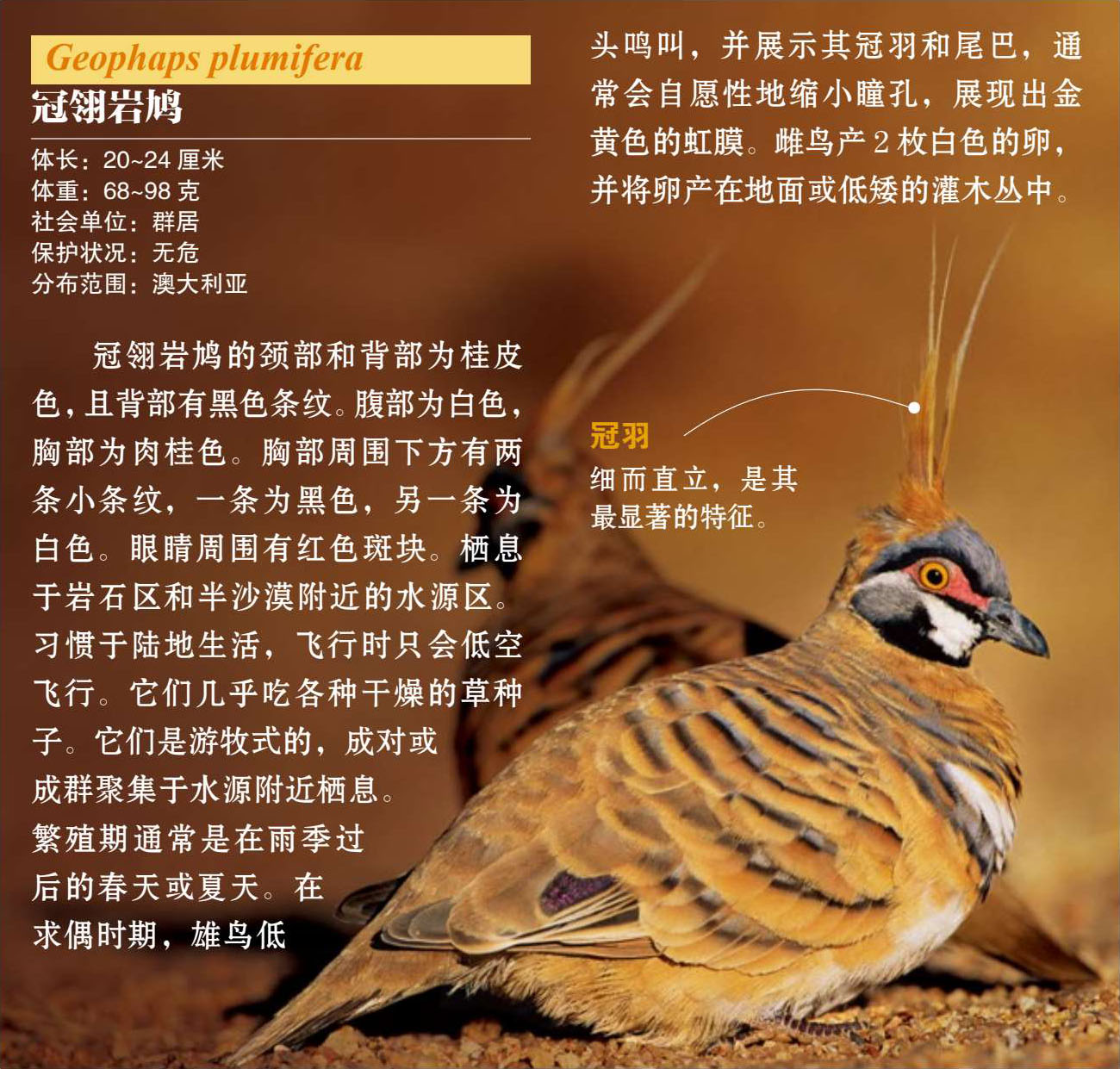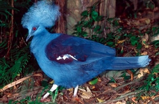 维多利亚凤冠鸠的颜色通常为浅蓝色,有一个独特的鸟冠,是世界上体形最大的鸽子。其主要食物为在地面上寻得的水果和种子。通常结成小群体一起行动。一夫一妻制。雌鸟所产的唯一一枚卵由双方共同孵化约1个月。哺育雏鸟也是由双方共同负责的。