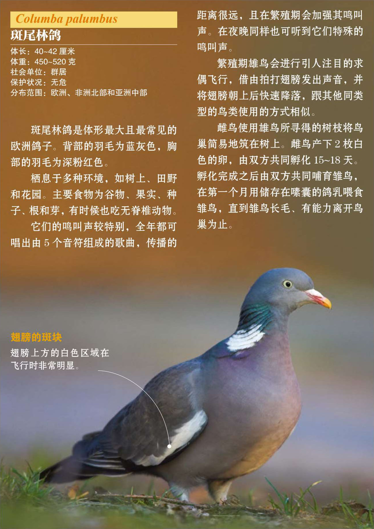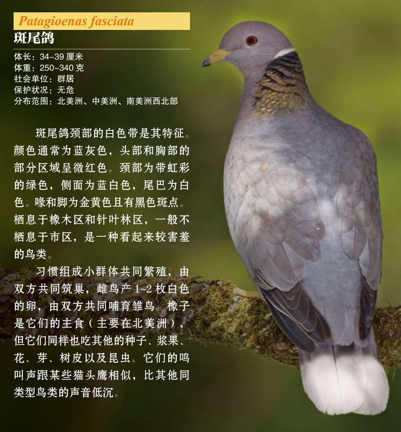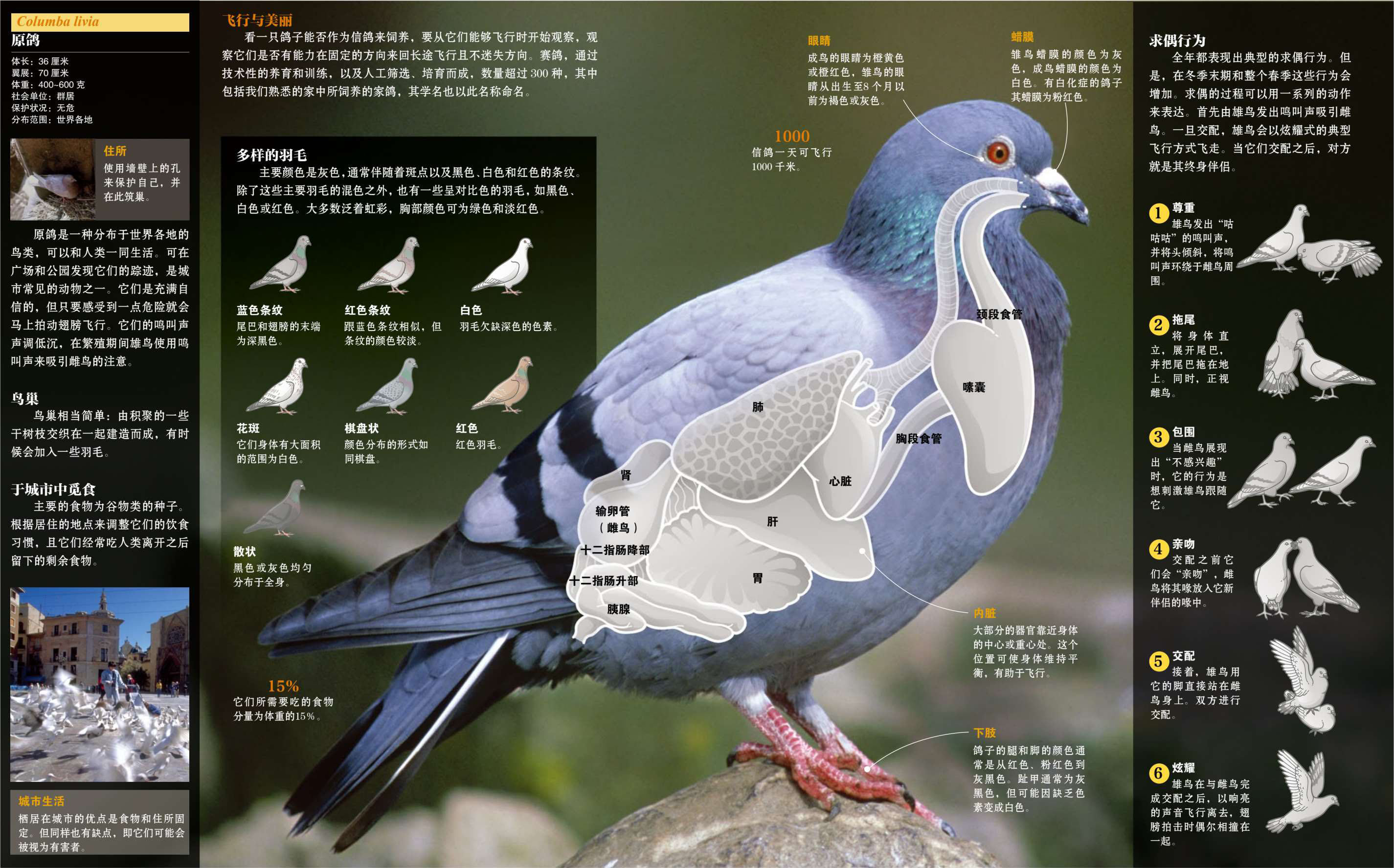 鸽子的体形健壮结实,头形较小,腿短且有鳞片。喙能让它们吸水时无须抬头。通常,它们的眼睛周围被裸露的皮肤包围。除了南极洲之外,它们栖息于世界各地的温带和热带地区,习惯栖居于陆地和树上,并且拥有利于飞行的肌肉。