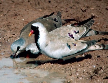 哀鸽中等体形,头部较小,尾巴很长。眼睛周围为蓝绿色的裸露的皮肤所包围。它们主要的食物为在地面上寻得的种子,也经常吃一些植物。习惯吃一些沙子,因为沙子有助于磨碎较硬的种子。浆果也是它们的食物,偶尔也吃昆虫和蜗牛。在求偶时期,雄鸟会发出一系列的鸣叫声,并喧闹地进行飞行展示。之后雄鸟和雌鸟双方紧密结合进行交配。