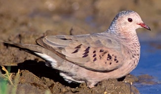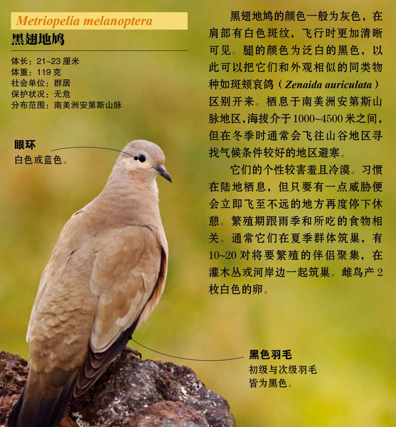 雄鸟的头部、颈部和腹部为粉红色,背颈部呈鳞片状。雌鸟的羽毛为灰色,翅膀上有明显的棕色斑纹,在飞行时可以清楚地看见。它们主要的食物为谷物,但也经常吃昆虫。成群移动,较喜爱开放的植被剥离土壤的空间。它们的鸣叫声单调且温和。