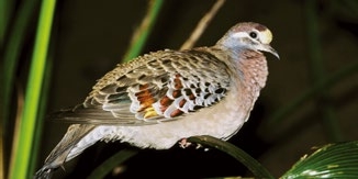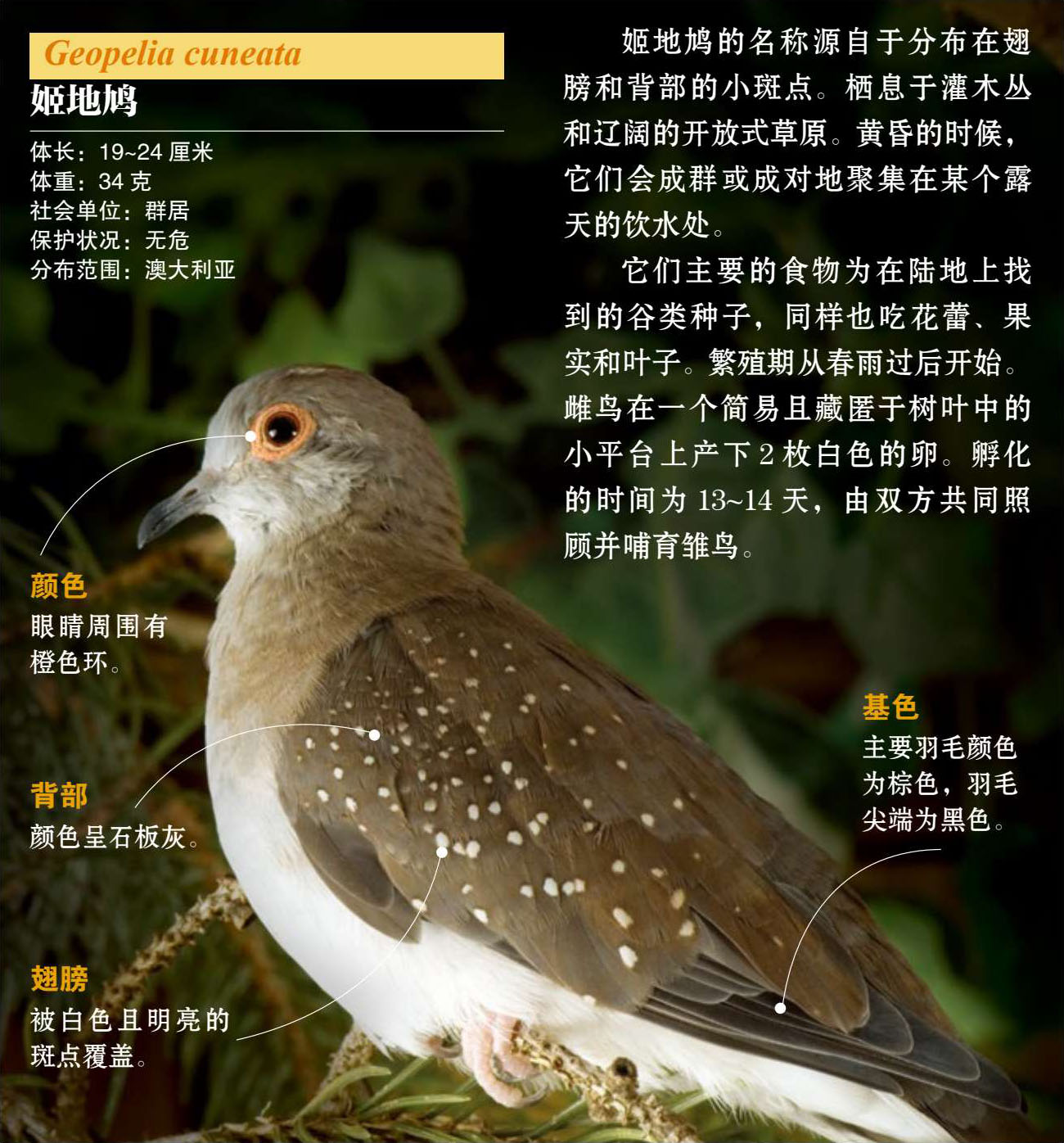 鳞斑地鸠是一种羽毛与众不同且引人注目的鸽子,羽毛颜色为灰色或褐色,边缘为黑色,外观看起来很像鳞片。它们天然的栖息环境包括亚热带灌木丛、热带潮湿地区以及季节性水淹草原。主要食物为谷类。它们吃各式各样在地面上寻得的种子。它们只在隐藏时发出鸣叫声,拍打翅膀时,会发出奇特的声音,让人联想到响尾蛇(响尾蛇属)。