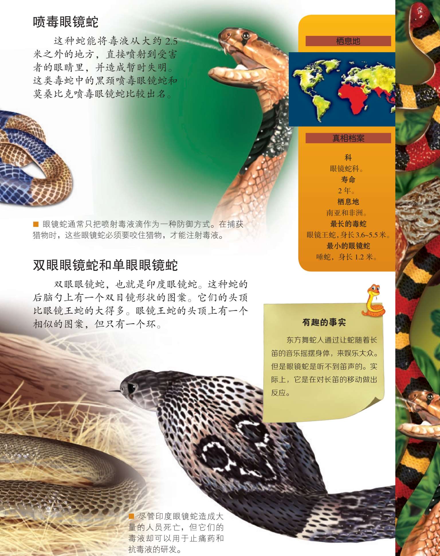 眼镜蛇以其致命的咬伤和能膨胀的头罩部位而闻名。当受到干扰时,它们会张开这个头罩,创造出既可怕又迷人的画面。几种眼镜蛇遍布亚洲和非洲。