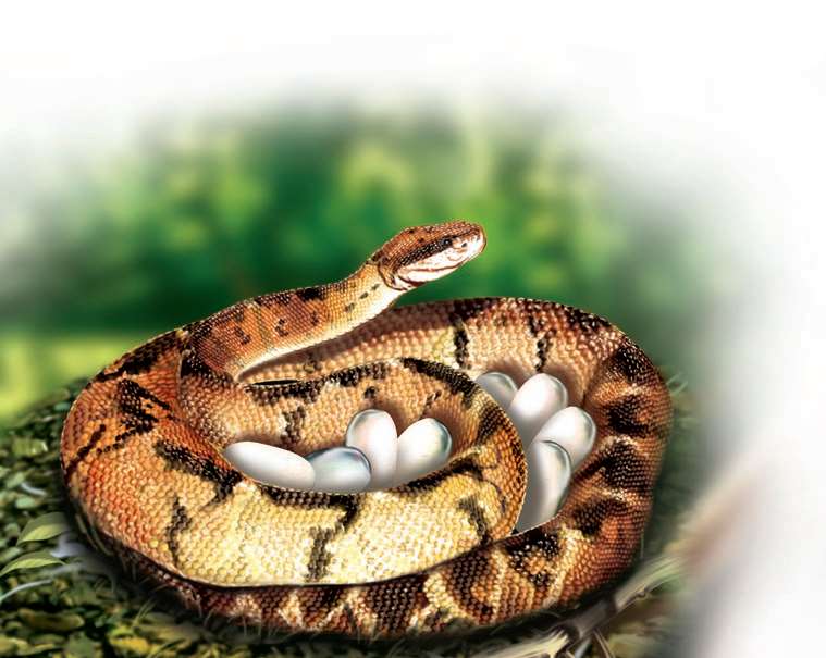 ■一条雌性巨蝮蛇把它的卵产在其他动物打造的地洞里。有时,巨蝮蛇甚至会与特定的动物共享洞穴。产卵后,蛇会保护蛇卵,直到它们孵化完毕。在这 70 多天的时间里,巨蝮蛇甚至不会离开洞穴去捕猎!
