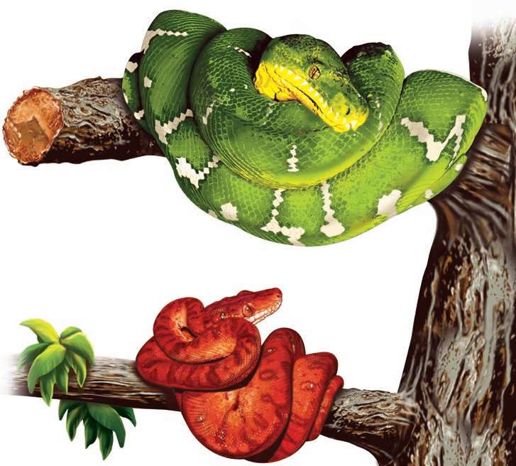 ■刚出生的翡翠树蚺通常是红色或橙色的。在一年时间里,这种蛇慢慢地变成了金黄色,然后彻底变为绿色。这种现象被称为“少年多态性”。成年蛇的绿色随着年龄的增长会越来越深。
