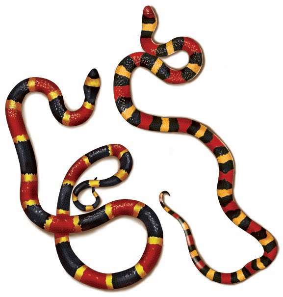 ■左图这两种蛇都生活在中美洲。它们有相同的颜色和条纹,这使它们看起来像同卵双胞胎!但如果仔细观察,你会发现假珊瑚蛇的尾巴有红色,而珊瑚蛇的尾巴是黄色和黑色的。