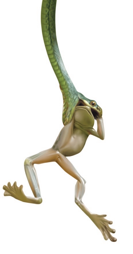 ■大多数的毒蛇会将毒液注入猎物体内,等待猎物死去。但它们中的一些蛇会将猎物活活吞下。大多数树蛇,像这条鹦鹉蛇,会用尾巴抓住树枝,倒挂着把猎物吞下去。