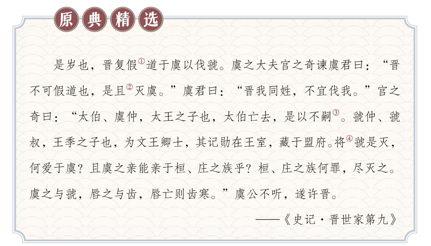 这一年,晋国再次向虞国借道讨伐虢国。虞国大夫宫之奇向国君劝谏道:“我们不能够向晋国借道,这会导致虞国的灭亡。”虞国国君说:“我们和晋国有同样的祖先,晋国是不会讨伐我们的。”宫之奇说:“太伯、虞仲,都是太王的儿子。太伯出走,所以没有继承君位。虢仲、虢叔,都是王季的儿子,文王的卿士,他们对周王室的功勋,记录就藏在盟府。如今虢国就要灭亡了,晋国又怎么会对虞国手下留情呢?况且虞国和晋国再亲近,哪里会有桓叔和庄伯的族人亲近?桓叔、庄伯的族人有什么罪过,要被全部杀尽。虞国和虢国,就像嘴唇和牙齿的关系,如果嘴唇没有了,牙齿就离灭亡不远了。”虞国国君不听宫之奇的建议,还是把路借给了晋国。