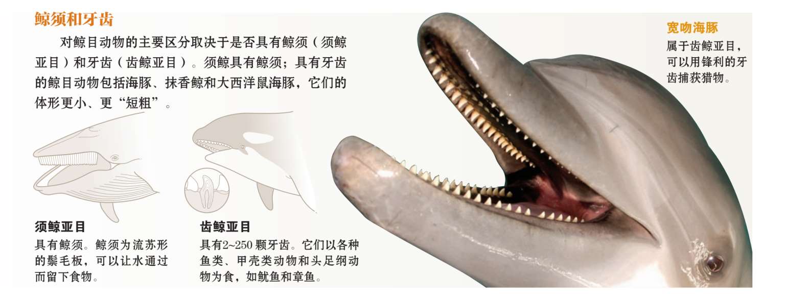 鲸目主要分为两个亚目:须鲸亚目,如鲸鱼;齿鲸亚目,如海豚。同人类一样,它们都用肺呼吸,在潜入水底前先吸足空气。它们在水中停留的时间从几秒钟至 1 小时不等,这样的适应性得益于它们的特殊结构。