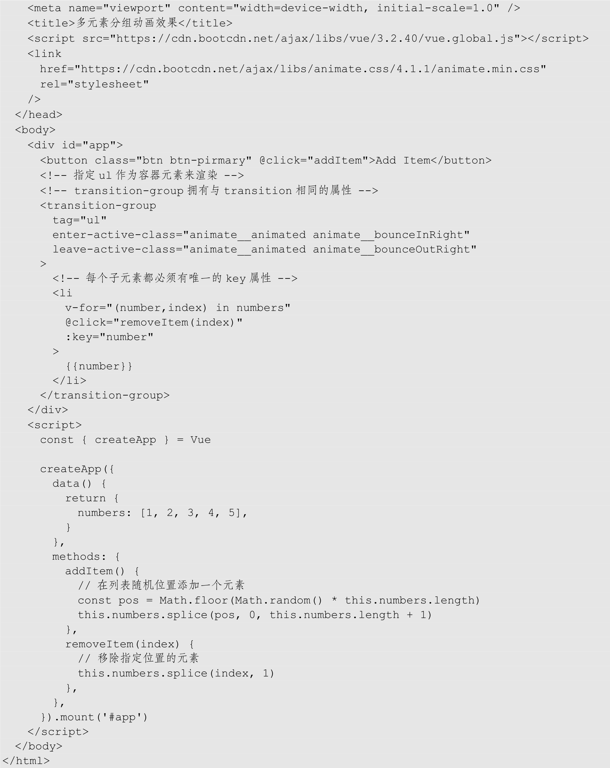 transition动画组件只能对单一元素进行动画控制,如果想实现列表等多元素的分组动画操作,则需要利用transition-group组件实现。transition组件与transition-group组件的属性基本一致,唯一不同的是,transition-group组件的tag标签属性指定一个元素作为容器元素来渲染,由于transition-group组件控制的是多元素的分组动画,因此必须给它包裹的每个子元素设置唯一的key属性来进行区分,否则无法实现动画效果。