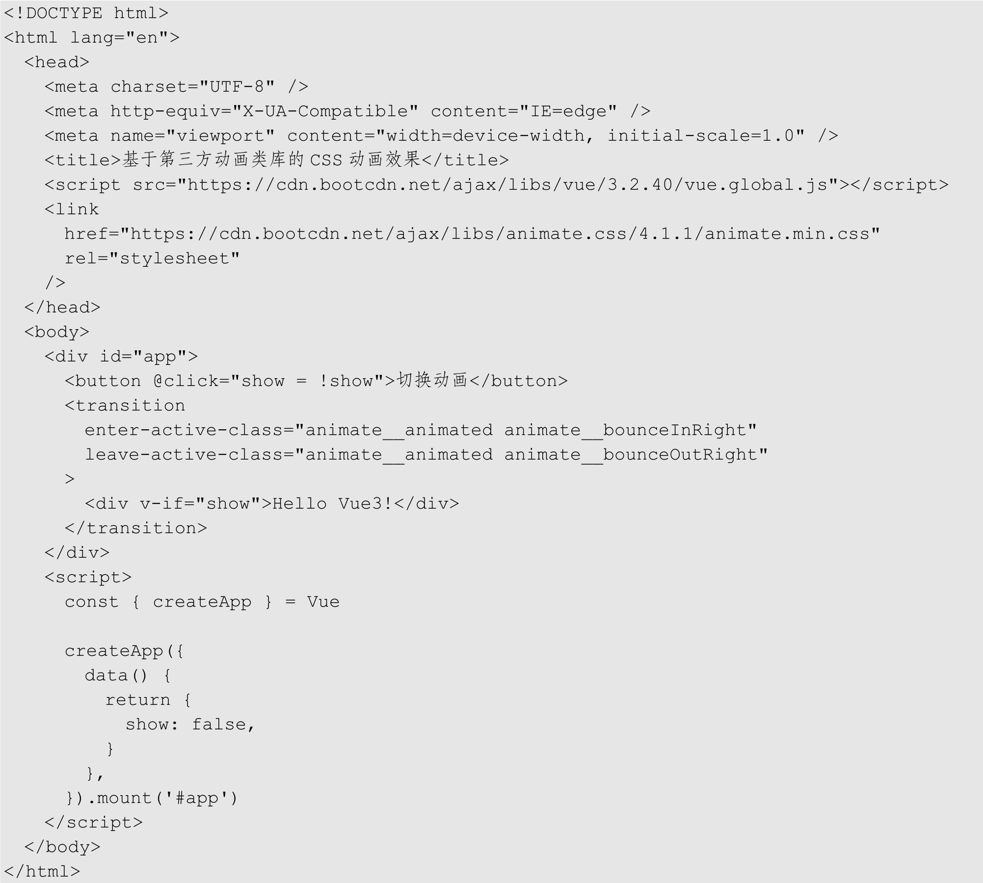 animate.css是一个拥有众多绚丽动画方式的CSS动画类库(这里只做简单演示,相关内容读者可自行查看bootstrap官方网站)。Vue为了更好地与第三方动画类库结合,为transition组件设置了enter-from-class、enter-active-class、enter-to-class、leave-from-class、leave-active-class、leave-to-class 6个样式绑定的属性,这6个属性的名称与之前的CSS动画类名大致相同,意义也相差无几,这里不多做讲解。