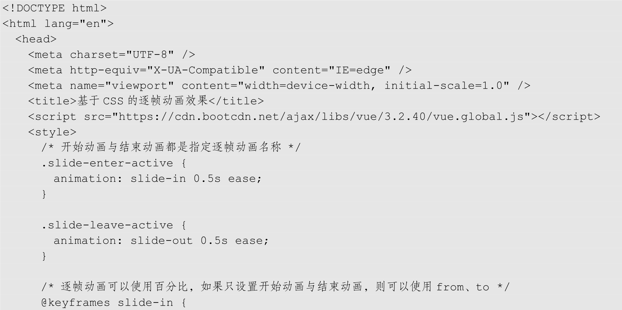 CSS的过渡动画只能实现开始与结束的动画效果,而animation逐帧动画却可以实现更丰富、更细腻的动画效果。不过对于Vue来说,不管是过渡动画还是逐帧动画,用户都是利用6个样式类来自定义样式类名,从而实现动画效果的。
