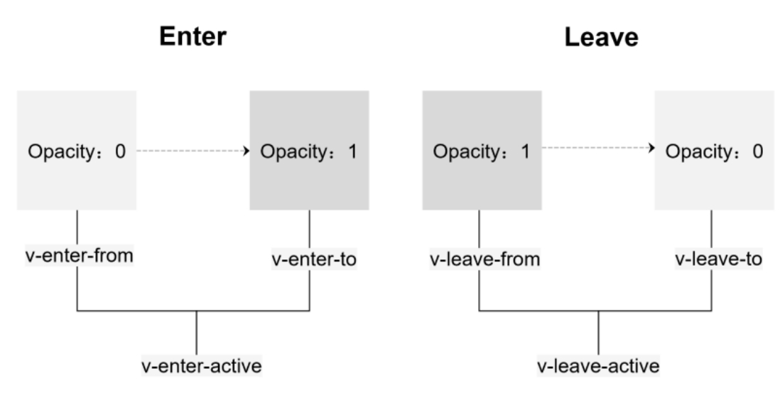 开始动画的类名主要有3个,包括v-enter-from(进入动画起始)、v-enter-active(进入动画生效)、v-enter-to(进入动画结束);结束动画的类名与开始动画的类名是对应的,主要有3个,包括v-leave-from(离开动画起始)、v-leave-active(离开动画生效),v-leave-to(离开动画结束),下面通过图2-54演示这6个类名发生的时刻。值得一提的是,动画类名中的v指代的是用户自定义的动画样式类名,而不是字面意义上的v字母。