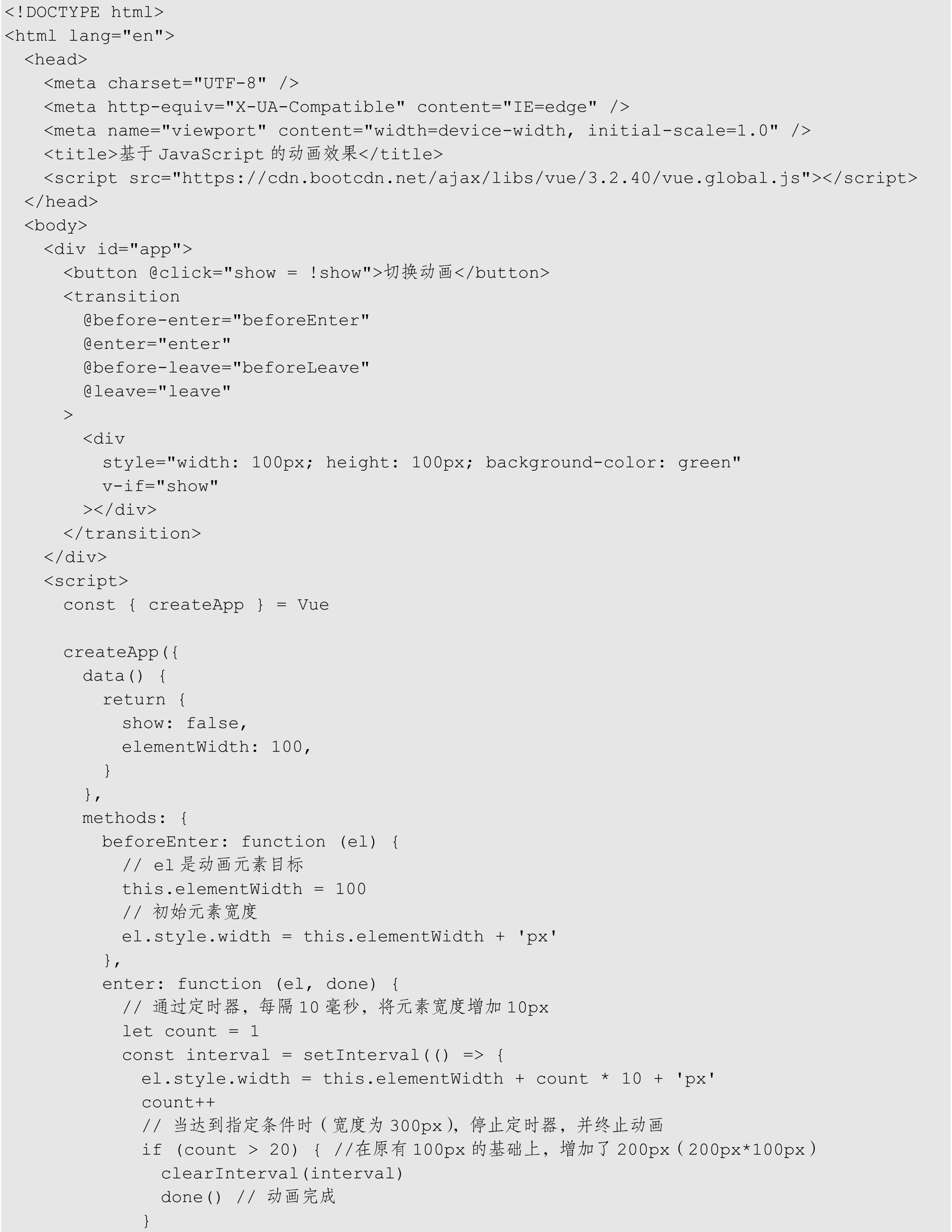 在Vue中,除了利用CSS实现动画效果,还支持JavaScript的操作实现。transition组件提供了8个有关JavaScript动画的钩子函数,主要包括before-enter(动画进入前)、enter(动画进入)、after-enter(动画进入后)、enter-cancelled(进入取消)、before-leave(动画离开前)、leave(动画离开)、after-leave(动画离开后)、leave-cancelled(离开取消)。从名称上来看,这8个transition组件提供的钩子函数与Vue生命周期钩子函数相似,但读者要知道它们是完全不同的。这8个transition组件的钩子函数的位置是在method方法当中,而不是与method方法并列。