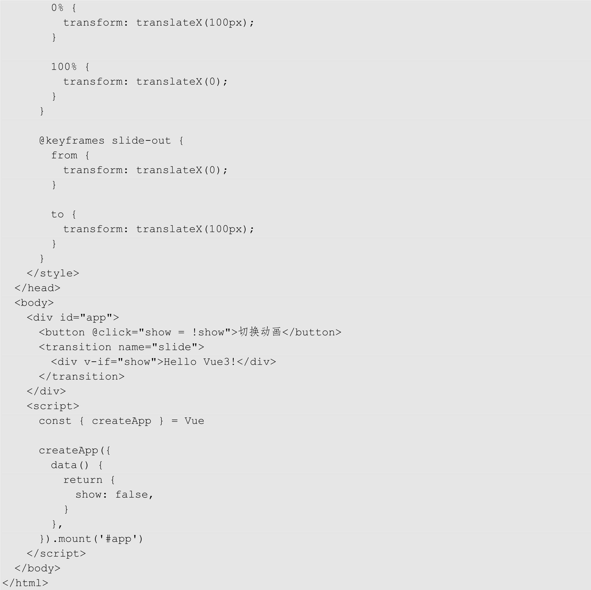 比如定义一个slide滑动逐帧动画效果,只需要在slide-enter-active和slide-leave-active中,指定slide-in与slide-out的逐帧动画名称,并在逐帧动画中利用百分比或者from、to来实现 X 轴位移操作。在自定义动画样式后,只需将Vue的transition动画组件的name属性值修改成slide,即可实现指定元素滑入位移和滑出位移的动画效果。