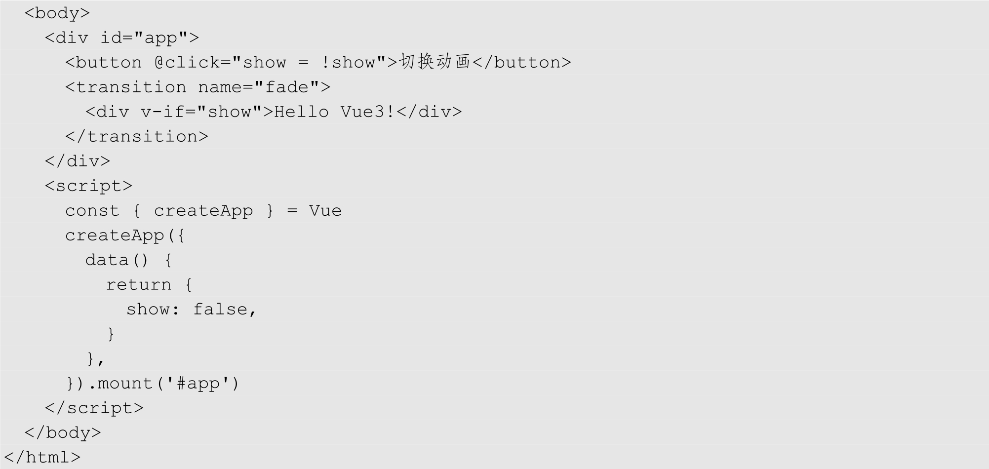 现在只需要利用内置组件transition包裹动画元素,并给transition组件设置属性name,name的值对应自定义动画样式名称fade。需要注意的是,transition组件的操控范围只限一个子元素,无法对多个包裹的子元素进行动画样式处理。