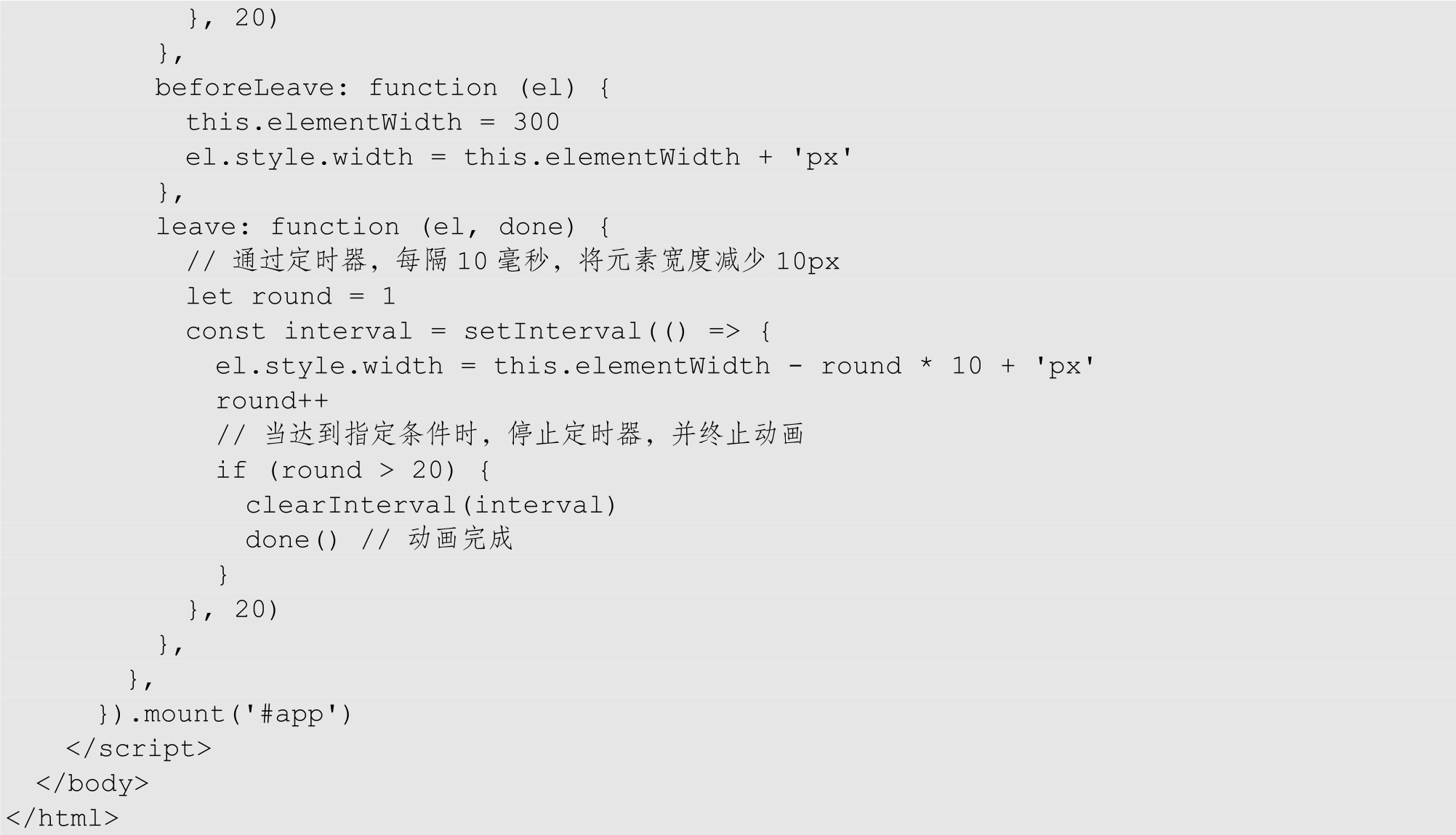 下面利用before-enter、enter、before-leave、leave这4个钩子函数实现一个进度条效果,请读者思考下面的代码。