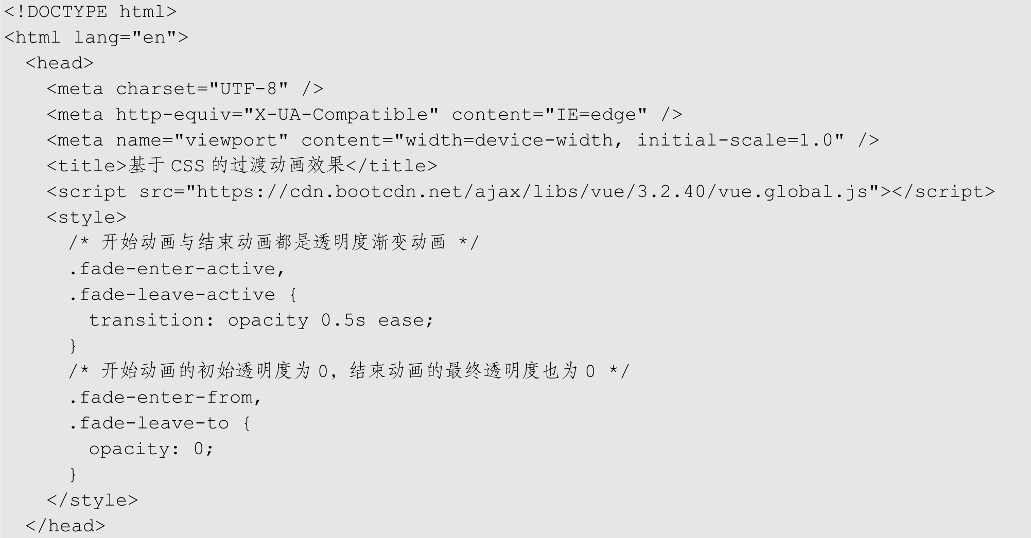 除了上面这种形式,我们还可以为过渡效果命名。比如fade-enter-active、fade-leave-active等自定义动画样式类名,就是利用fade单词替换了动画类名中的v字母。这就是自定义动画样式的类名规则,即只能使用自定义动画样式名称替换v字母,后面的命名规则不可改变。