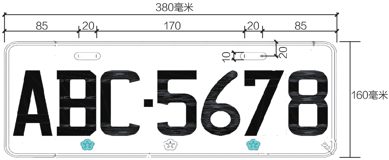 第八代台湾车牌配色与前一代车牌保持一致,原来的临时车牌和军用车牌等同样延续第七代车牌的形式,不强制民众换牌。第八代台湾车牌的主要变化是在上一代早期各型车牌编码上增加一个字符,以拓展可用编号,如自用、租赁小型客(货)车与身心障碍者专用车拓展成3个字母加4个数字(XXX-9999);各类大小型营业客(货)车、游览车与交通车拓展成3个字母加3个数字(XXX-999);拖车拓展成2个字母加3个数字(XX-999)等。图2-85为台湾在用第八代(新式)车牌示意图(表格截图)。同时,车牌上侧也不再使用管辖属地地名标识;由于英文字母增加一位,号牌加长,厚度变薄,故取消下方螺丝锁孔,改为梅花图案;另增加激光细微字雕刻、折边,以及使用防止变造的字体。汽车号牌长度增至380毫米,宽度增至160毫米,如图2-86所示。