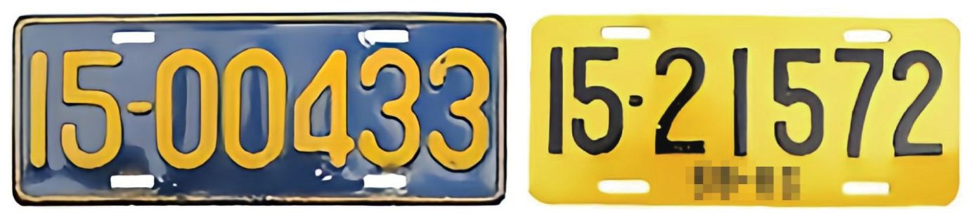 第二代台湾车牌发行于1948—1958年,车牌格式为“15”后接四位数字,如图2-78所示。“15”是台湾省车牌代码。