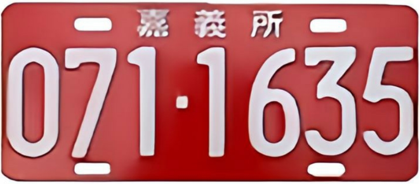 1921—1945年,台湾车牌格式为“汉字加数字”。表示地域的汉字共有“北”(台北州)、“新”(新竹州)、“中”(台中州)、“南”(台南州)、“高”(高雄州)、“花”(花莲港厅)、“东”(台东厅)和“澎”(澎湖厅);初期数字仅有两位,后扩充至三位,其中“北”在末期有四位。车牌颜色,自家用车为黑底白字,营业用车为白底黑字;但高雄州除外,车牌统一都是黑底白字。每辆车的前后都要挂车牌,但挂在哪个位置,并不像现在规定这么严格,放左放右放中间,都听任自便。1945年前台湾车牌如图2-77所示。