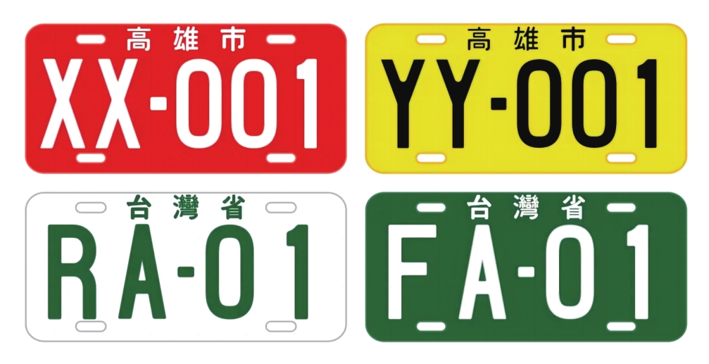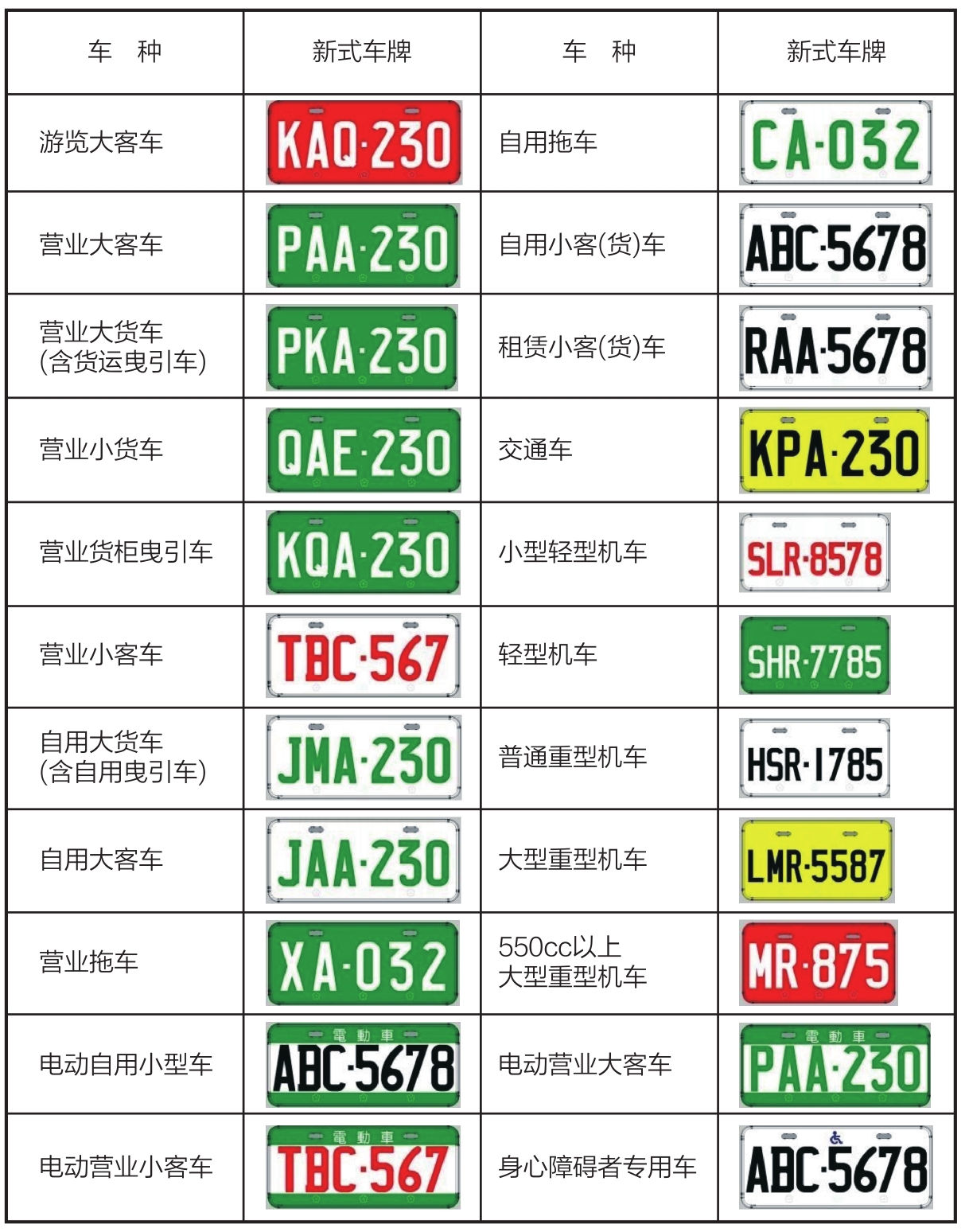 图2-82 早期第七代台湾车牌常见车种车牌配色与编号示意