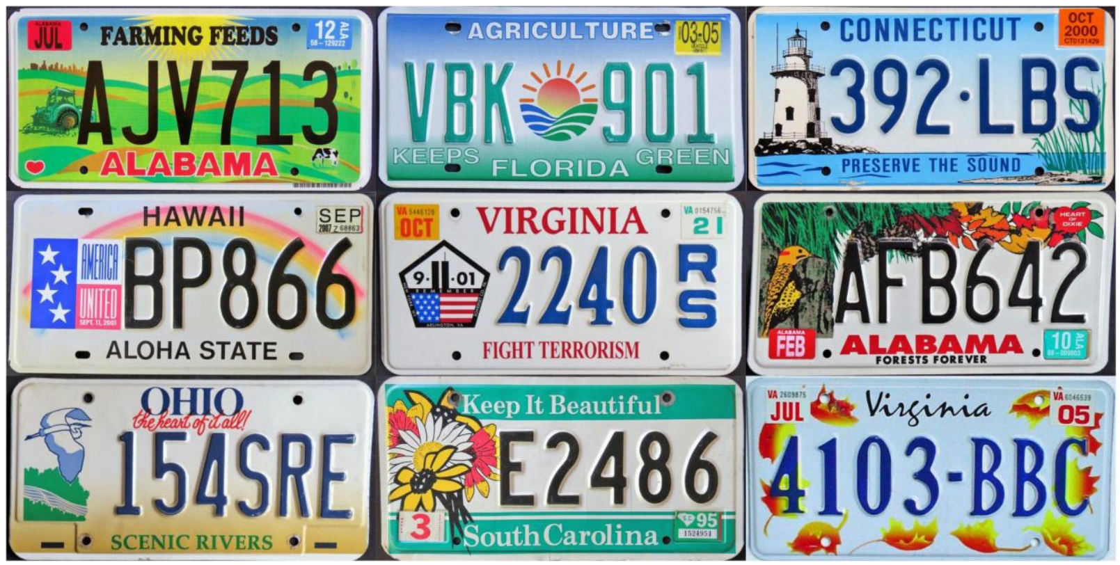 美国现行车牌编号通常由字母和数字组合而成。由于各州或特区的人口和登记车牌的数量相差较大,为提供充足的独立车牌编号资源,美国各地车牌编号的格式与位数也不尽相同。例如,特拉华州和罗得岛州等小州,使用“999999”这种六位阿拉伯数字格式即可满足本州需求,而人口第一大州加利福尼亚州,则使用“9XXX999”的编号格式,以确保能为本州超过3000万辆登记车辆提供足够的编号资源,其他几个人口大州也有使用“XXX-9999”或“XX-99999”七字符的编号格式。各式美国车牌如图3-1所示。