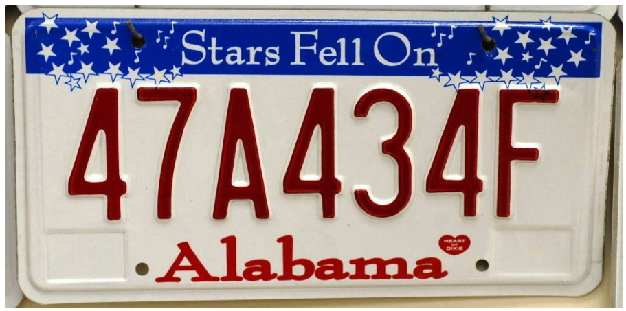2002年,该州将“流星坠落在亚拉巴马”(Stars Fell On Alabama)印制在车牌上,“流星坠落”(Stars Fell On)位于车牌上部,而“亚拉巴马”(Alabama)在车牌下部,带有“迪克西之心”的红心图案缩小位于车牌右下方,如图3-9所示。“流星坠落在亚拉巴马”的使用,要追溯到1833年11月12—13日,那时该州整个东南部,晚上出现大面积狮子座流星雨,成千上万的流星划破苍穹,照耀大地,这一奇观让人们很兴奋,以致民间有各种传说,多年来被广为传颂。1934年,卡尔·兰森·卡默出版自传《流星坠落在亚拉巴马》;同年,盖伊·伦巴多乐队录制与该书同名的歌曲。该歌曲又先后被包括鲍勃·迪伦在内的百余位歌手传唱。受此书与歌曲的启发,2002年,“流星坠落在亚拉巴马”被印制在该州车牌上。