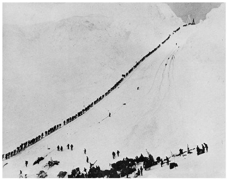 1997年,为纪念阿拉斯加州淘金热100周年,阿拉斯加州车牌上的宣传语开始使用“淘金热”(Gold Rush)。新的车牌做了一些精妙的设计。例如,将“阿拉斯加”(Alaska)中的第二个“A”用淘金中常用的锹和镐组合设计,车牌背景采用淘金者正在白雪中一路紧随翻过雪山,而这一路黑色背影的队伍正好把“XXX 999”式的车牌编号字母与数字分开,颇具层次感,如图3-16所示。图3-17为淘金矿工翻过雪山照片。该车牌设计获得美国车牌收藏家协会认可,被评为1998年最佳车牌,这也是阿拉斯加州车牌首次获此殊荣。或许因为获奖的原因,该款车牌一直连续使用至2004年。