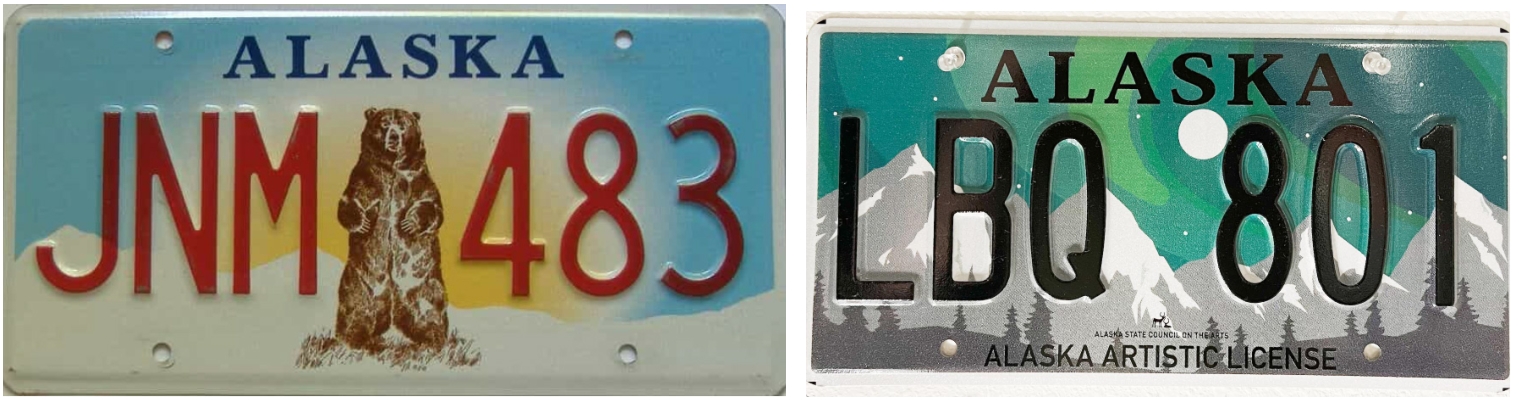 图3-19 目前可以选用的两款阿拉斯加州车牌(左为2015年发行,右为2019年发行)