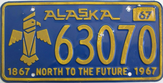 阿拉斯加州从1921年要求悬挂车牌,直到1965年,并未在车牌上印制其他宣传内容。1966年,为了纪念这一历史性事件,车牌式样有了较大变化:将原来车牌左侧的州旗换成了古老的鹰形图腾柱,车牌下部左右角分别印制“1867”和“1967”字样,车牌上部的“阿拉斯加”英文字体也进行了更加风格化的处理,车牌上首次印制宣传语“向北到未来”(North to the Future),车牌整体看上去更加饱满和艳丽,如图3-13所示。宣传语“向北到未来”是在阿拉斯加成为美国领土百年纪念竞赛活动中挑选出来的,它由州府朱诺市资深新闻记者理查德·彼得结合该州地处美国最北端的地理位置提出,寓意该州是充满希望的乐土。根据提出者的说法,这句宣传语目的在于提醒人们,在城市杂乱的地平线之外,阿拉斯加州有一大片土地,可以为那些“拥挤在城市又渴望自由的民众”提供一个新的明天。2004年,“向北到未来”正式被阿拉斯加州法律定为该州格言。