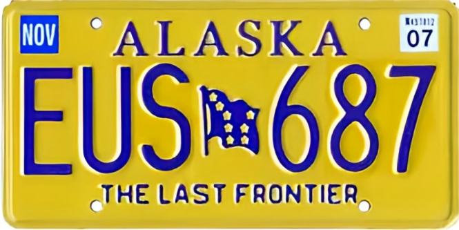 2004年以后,阿拉斯加州发行的车牌回到以前的经典车牌样式,虽然字体有所调整,文字增加了黄色阴影,但与1981—1997年发行的车牌设计基本相同。车牌中央仍是一面带有星星的旗帜,州旗上的星星是北斗七星和北极星,它们分别象征力量和阿拉斯加州所处的北部位置。车牌上的宣传语仍然采用“最后的边疆”,如图3-18所示。