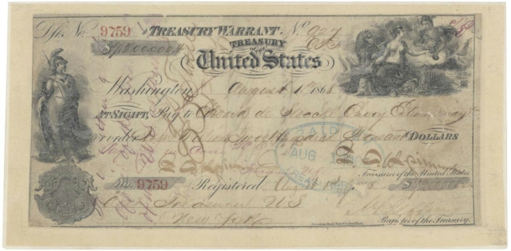 荒野、冰雪、严酷、崎岖、壮美、广袤、极昼、极夜、无人区、北极光,将这些词语放在一起,你会想到哪里呢?阿拉斯加州原本是俄国在美洲的一块殖民地,俄国因为未能从中获利,又担心被夺走,加之与英法的克里米亚战争失败,急于输血,所以在1867年10月18日以720万美元的低价将其出售给美国。购买阿拉斯加720万美元的支票如图3-12所示。