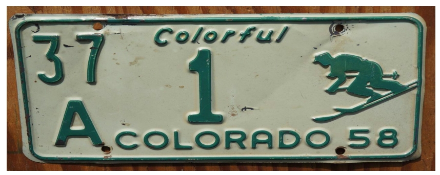 在1958年推出的车牌中,车牌右侧印制有滑雪者图案,如图3-37所示。不用说,这是为了宣传该州是滑雪胜地。该州西部属于洛基山脉,东部主要为高原地形,全州海拔4000米以上的高山超过50座,平均海拔2072米,是美国50个州中地势最高的一个州。因此,该州拥有众多优质滑雪场,常年跻身美国滑雪胜地排名前列。图3-38为1974年科罗拉多州车牌。