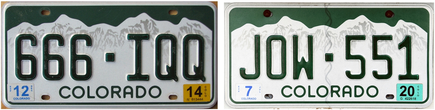 2000年,科罗拉多州推出了新的车牌,绿色或褐白相间的颜色,背景图案是落基山脉,展示了该州最高的山峰埃尔伯特峰,带有浮雕山峰设计,几乎延伸到车牌顶部,如图3-41所示。