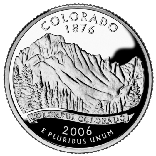 1640年,西班牙人发现当地的大河——科罗拉多河,河两岸赭红色景观和该地区的红色砂岩地应是该州州名最初的起源,因此被叫作“Colorado”,意思是“有颜色的(河流)”。科罗拉多州也被称为多彩科罗拉多(Colorful Colorado),主要是源于该州壮丽多彩的山脉、河流和平原。“多彩科罗拉多”这个称谓被广泛用于该州地图、汽车牌照、旅游信息和各式纪念品。图3-36为25美分科罗拉多州纪念币背面。