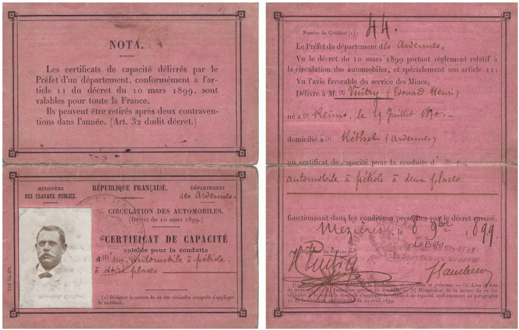 图1-2 法国巴黎在1899年发出的机动车驾驶能力证书