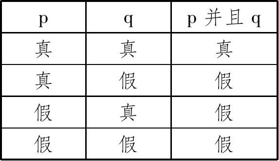 我们把“p并且q”看作联言命题的标准表达形式,其中p、q称为联言支。逻辑学研究命题是为了研究推理,从具体的推理抽象出一般的推理形式,其最重要的特性就是保真性:该推理形式本身能够确保从真前提推出真结论。因此,从推理的角度看命题,命题最重要的性质就是它的真值;就复合命题而言,则是一复合命题的支命题与该复合命题本身在真假方面的相互关系。就联言命题来说,只有它的各个支命题都是真的,它本身才是真的;如果有一个支命题为假,则联言命题为假。也就是说,一个联言命题是真的,当且仅当它的各个联言支都是真的。见下面的真值表: