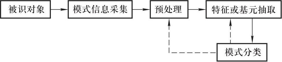 如前所述,视觉信息和听觉信息是人类赖以实现模式识别的基础,也是模式识别的两个重要方面,代表性产品有光学字符识别、语音识别系统。模式识别的全过程如图2.1所示。模式信息采集是获取被识别对象的特征,如电压、电流等电量,或灰度、色彩、声音、压力、温度等非电量。对于非电量还必须先转化为电量,然后再经模拟-数据(A/D)转换为计算机可以接受的信息。对信息进行预处理是指滤掉样品采集过程中可能引入的干扰信号,人为地突出有用信号,以便获得良好的识别效果。对经过改善的有用信号进行特征或基元抽取,才能正确地分类。抽取准则和方法是模式识别研究的一个重点。特征抽取或基元抽取不是一次就可以完成的,需要不断地修改和完善,图2.1中虚线即表达此意。模式分类是模式识别的关键,它是在前几步准备工作的基础上,将被识别对象进行分类。