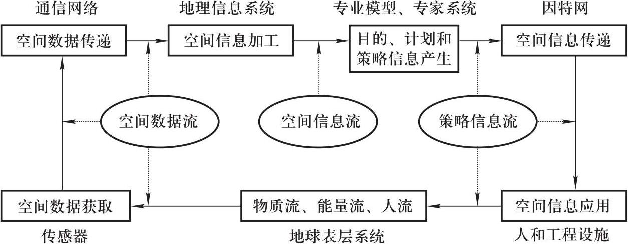 图1.2 空间信息流与地球表层系统内部物质流、能量流和人流的关系