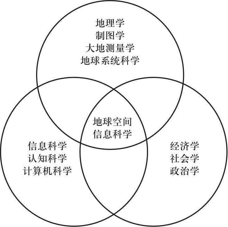地球空间信息科学是一门交叉学科,是地球系统科学与面向地球空间研究领域的地理学、制图学、大地测量学,面向人类心智、行为和语言的认知科学、环境心理学、语言学,面向信息计算的计算机科学、信息科学,面向信息应用的经济学、社会学、政治学等诸多领域学科的交叉融合,如图1.3所示。