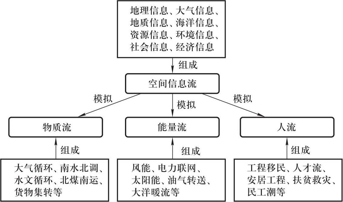 地球表层系统物质流、能量流和人流(合称“三大流”)的运动规律可以通过研究地球表层系统的空间信息流来认识和理解,图1.2所示即为“三大流”的组成内容及空间信息流的具体内容。
