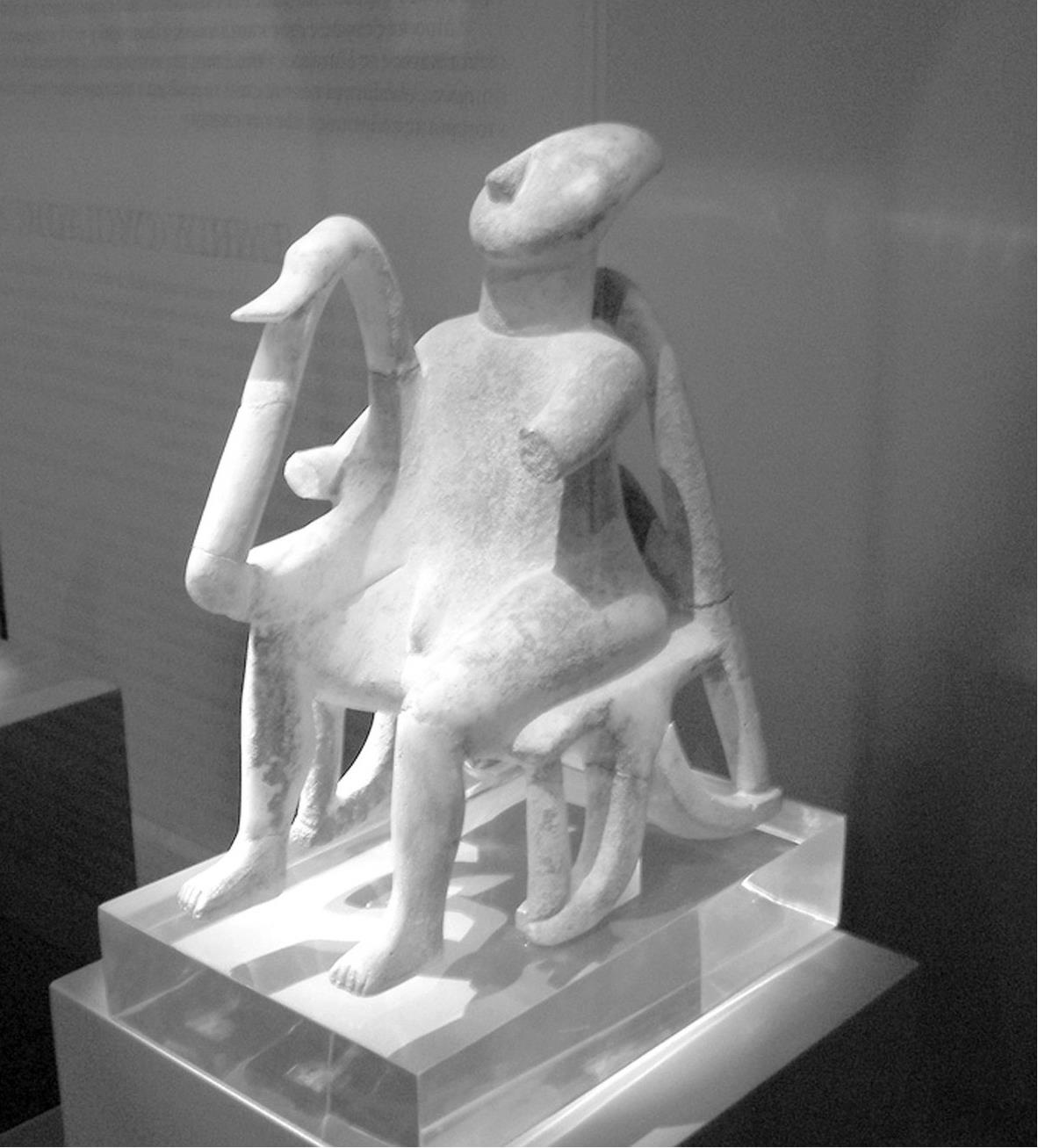 同样,《弹竖琴者》也是以一种高度简约的样式来塑造形象和表达情绪的。管状的实体犹如线条般地勾勒出了一个完全沉迷在音乐中的乐师形象以及竖琴和椅子。如果说女性偶像可能与宗教仪式有关,那么,这一乐师的造型又有什么特殊的用途呢?