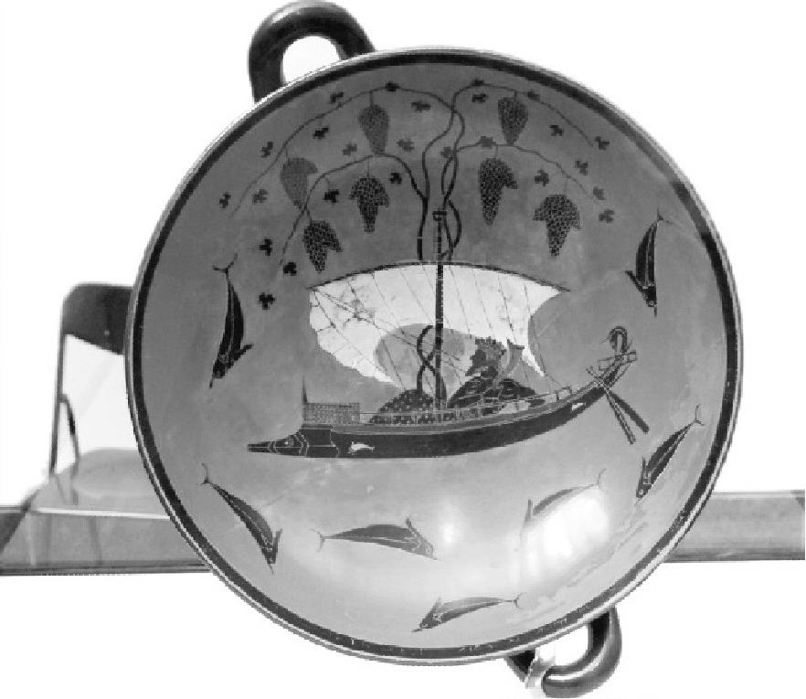 图2-30 埃克塞吉亚斯《狄奥尼索斯渡海》(约公元前540),双柄杯,慕尼黑国家古代收藏馆。