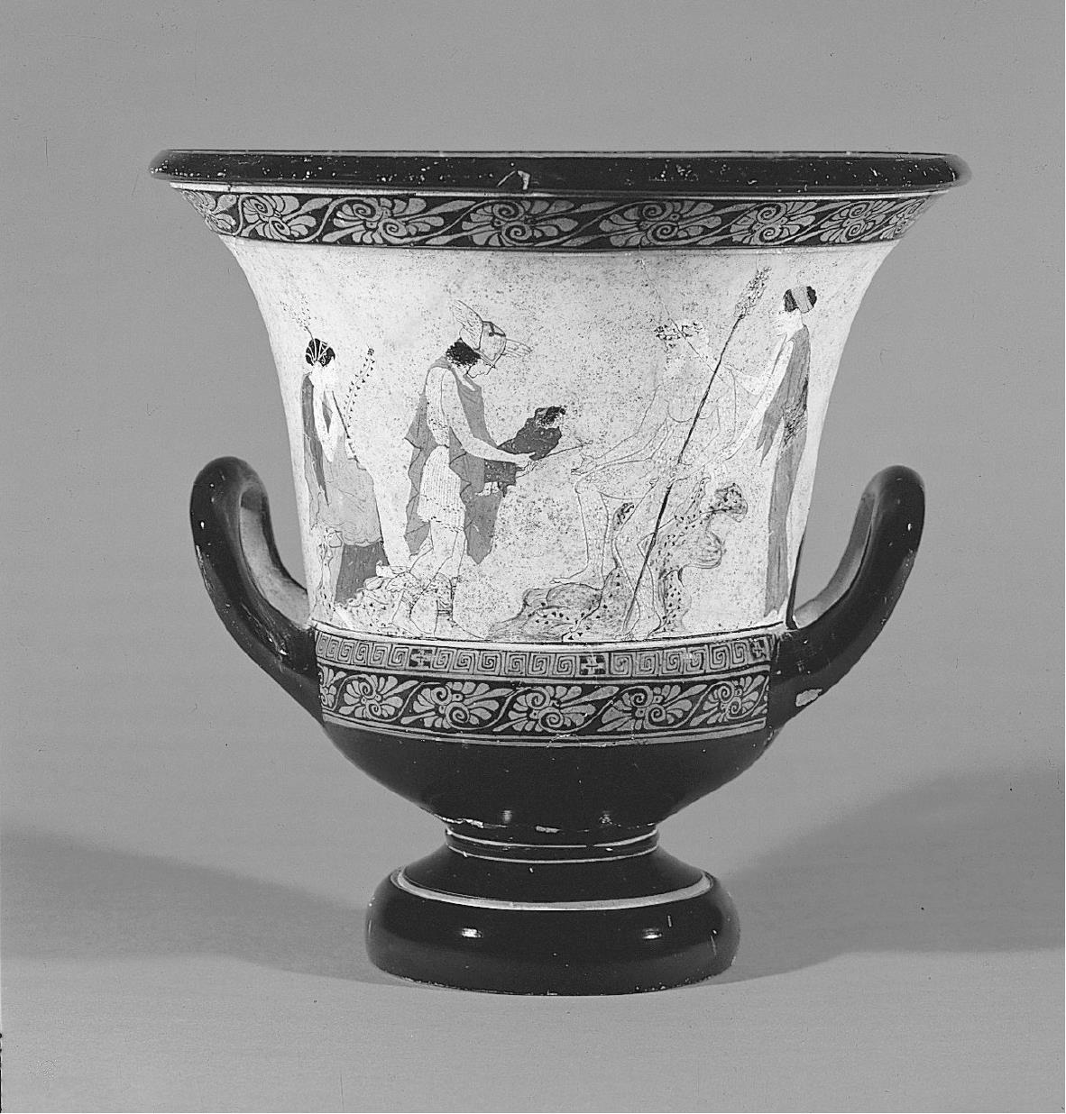 图2-32 “菲阿勒画家”《赫尔墨斯将婴儿狄奥尼索斯交给林中仙女和老森林之神》(约公元前440—前435)。
